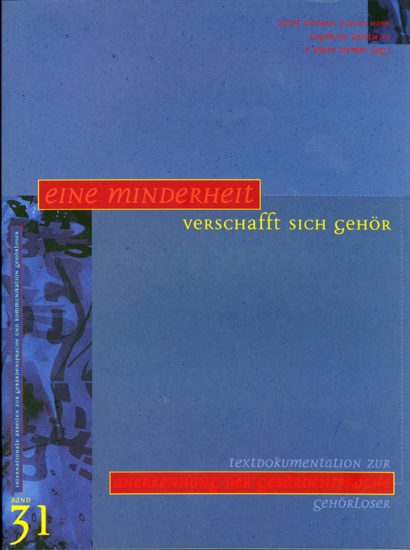 Eine Minderheit verschafft sich Gehör. Textdokumentation zur Anerkennung der Gebärdensprache.The impulse to put this collection together was the 2nd International conference on Deaf History, which took place from the 1st-4th of October 1994 at the University of Hamburg. This conference was a combined effort of the Association Deaf History International, the German Society for Sign Language, and the Centre for German Sign Language and Communication of the Deaf (Hamburg). Anerkennung von Gebärdensprache ist nicht das Resultat eines speziellen Gesetzes, daß man sagt: Da will ich die Anerkennung und da geh ich hin. Das Problem ist wesentlich komplexer, wesentlich vielfältiger, und darum passiert Anerkennung eigentlich überall, indem ich immer wieder reagiere, indem ich immer wieder dafür sorge, daß sich unsere Gesetze zum Positiven verändern und zwar in jedem einzelnen Bereich, wo wir merken, daß Lücken entstehen, und wo wir handeln können. (Ulrich Hase auf dem Kongreß zur Zweisprachigkeit Gehörloser in Hamburg, Oktober 1993) Während die internationale Gebärdensprachforschung in den letzten Jahrzehnten den Nachweis geliefert hat, daß Gebärdensprachen systematisch strukturiert und somit genauso wie Lautsprachen als Sprachen anzuerkennen sind, steht die diesbezügliche Anerkennung in vielen gesellschaftlichen Bereichen der Bundesrepublik Deutschland noch aus. Der vorliegende Band dokumentiert Stellungnahmen seitens Gehörloser sowie VertreterInnen gehörlosenspezifischer Fachverbände, aus Wissenschaft, Politik und öffentlichem Leben, in denen sich diese für eine gleichberechtigte Teilhabe Gehörloser am gesellschaftlichen Leben der hörenden Mehrheit einsetzen und eine entsprechende Einbeziehung der Gebärdensprache Gehörloser fordern. Donath, P. und U. Hase, S. Prillwitz, K. Wempe: Eine Minderheit verschafft sich Gehör. Textdokumentation zur Anerkennung der Gebärdensprache. Broschur / Paperback, 218 Seiten, Signum 1996, ISBN 3-927731-60-9. EUR 15,33 |
