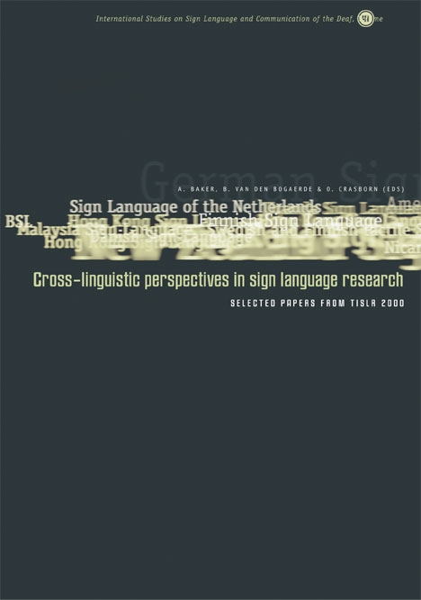 Baker, A., B. van den Bogaerde & O. Crasborn (eds): Cross-linguistic perspectives in sign language research. Selected papers from TISLR 2000. Paperback, with CD-ROM, 352 Seiten, Signum 2003, ISBN 3-927731-88-9. EUR 45,00.