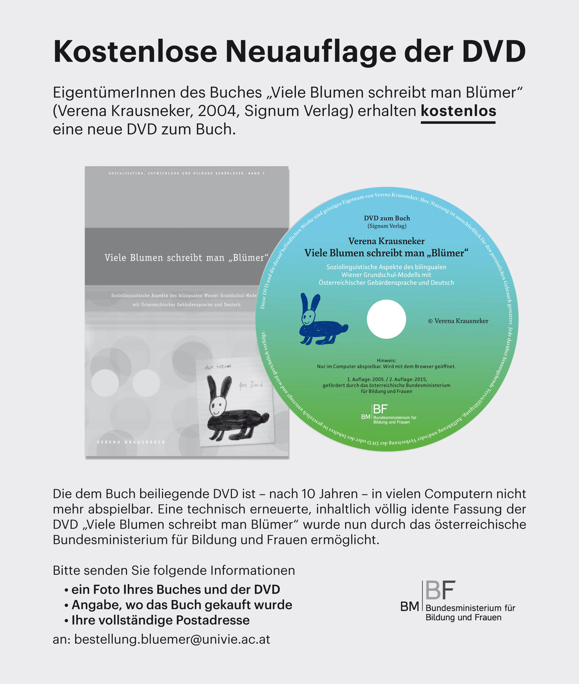 Weil die DVD, die die dem Buch „Viele Blumen schreibt man ‚Blümer‘“ seit der Veröffentlichung 2004 beiliegt, in den meisten PCs heutzutage aus technischen Gründen nicht mehr abspielbar ist, hat die Autorin ein Update dieser DVD durchgeführt. Die neue DVD kann durch die finanzielle Hilfe des österreichische Bildungsministeriums kostenlos an alle Käufer des Buches verteilt werden. Das Update wird direkt von der Autorin zur Verfügung gestellt. Kunden, die das Buch über den Signum-Verlag erworben haben, können sich einfach an die Autorin wenden, um ein Exemplar der aktualisierten DVD zu erhalten. Der Verlag leitet Ihre Anfrage aber auch gerne für Sie weiter.